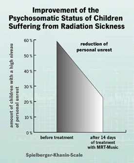 due the nuclear accident of Chernobyl. They stayed in hospital for 14 days and received every day a 30 minute treatment with Medical Resonance Therapy Music. The psychosomatic status was evaluated by the help of the Spielberger-Khanin scale. Prior to the treatment 59,1% of the children displayed great personal unrest, they felt great strain and grave worries about the possibility of an unsuccessful outcome of the treatment of their illnesses. Likely complications and side-effects arising from various forms of treatment produced nervous reactions in them. |